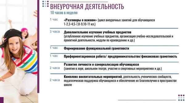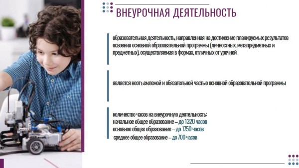 Внеурочная деятельность школьников- это совокупность всех видов деятельности, в которой в соответствии с основной образовательной программой образовательного учреждения решаются задачи воспитания и социализции, развития интересов, формирования универсальных учебных действий. Внеурочная деятельность может быть организована по следующим видам деятельности: игровая, познавательная, досугово-развлекательная деятельность, художественное творчество, техническое творчество, спортивно-оздоровительная деятельность и т. д.